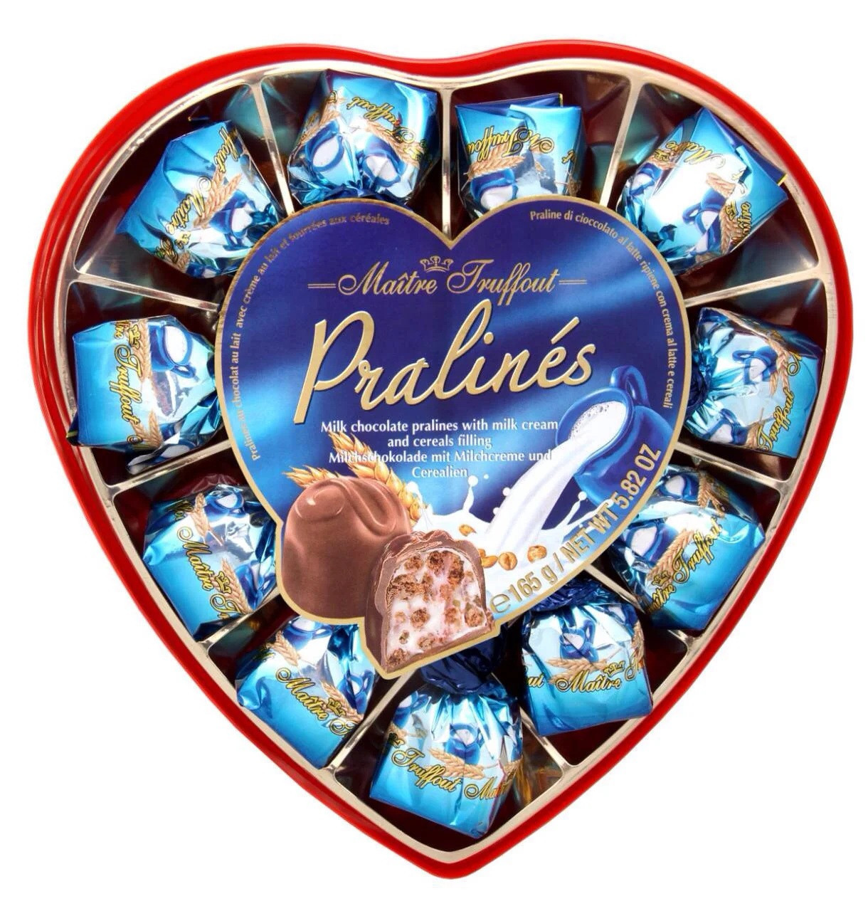 Maitre Truffout milk cream and cereales – це цукерки праліне з натурального молочного шоколаду з молочної кремовою начинкою та злаками. Цукерки упаковано в оригінальну коробку, яка оформлена у вигляді серця. Такі солодощі можна подарувати дорогим і улюбленим вам людям. Шоколадні цукерки австрійського бренду зроблені з якісного шоколаду і яскравою начинки, для створення неповторного смаку. Таке ласощі скрасить ваше чаювання або внесе яскравості ранкової кави. Красива упаковка відмінно виглядатиме на будь-якому святковому столі.